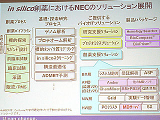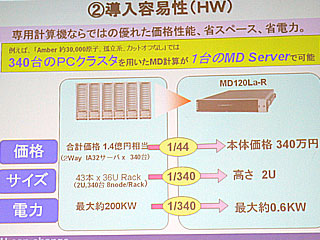 MDエンジンは、もともとは1992年度からの通産省プロジェクトの成果として開発されたもので、富士ゼロックスでは事業として大きな成功を収めることができなかった。しかし、NECが創薬研究支援ソリューションをハード・ソフト・サービスの広がりで手がける中において、MDエンジンは強力なシナジーを発揮する製品アイテムになり得るという判断があったという。また、最新の半導体技術を反映させることで一段の高速化が達成されており、研究者がシミュレーションの検討を1日単位で行えるようになったことは、普及へのブレークスルーポイントに達したとみることができるとしている。さらに、現時点でナノ秒オーダーまでのMD計算が可能になってきたわけだが、注目を集めているたん白質のリン酸化などはミリ秒オーダーの現象であり、いまよりも1,000倍速い計算機が必要。将来にわたってMDエンジンの改良強化を続けていけば、非常に大きな市場が開けてくるという狙いもある。
