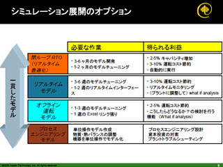 同社のロードマップでは、現在は“オフライン運転モデル”として運転方針の検討に利用するスタイルとなるが、将来的にはプラントの実データをリアルタイムに近いかたちで解析して経済性などを考慮した最適化を図る“リアルタイムモデル型”、さらには高度制御プログラムと組み合わせて最適プロセス条件でプラントを自動運転させる“リアルタイム最適化運転モデル型”までの発展を視野に入れているようだ。