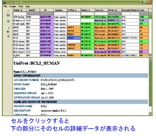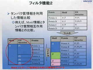 情報はすべて独自のスプレッドシート上に表形式で展開されるので、一覧性が高く、重要なポイントをみつけやすい。また、フィルタリング機能を利用して、リストの中で重複しているたん白質をみつけ出し冗長性を排除したり、アノテーション同士を比較してグルーピングすることにより、データ間の関連性を探り出したりすることも可能。(写真参照)