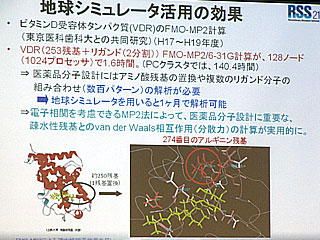 最近の事例では、2型くる病の原因だとされるビタミンD受容体たん白質(VDR)の解析例がある。このたん白質の274番目のアルギニンがロイシンに置換されることによって発症することがわかっているが、それを計算でも確かめた。地球シミュレータでは、253残基のVDRとリガンドの複合体を、ファンデルワールス相互作用を考慮できるFMO-MP2/6-31Gで計算した。計算時間は128ノード(1,024プロセッサー)で1.6時間。実際の創薬研究では、アミノ酸残基の置換や複数のリガンド分子の組み合わせで数百パターンの解析が必要だが、この計算時間だと1ヵ月ほどで解析が終わることになるので、十分に実用になるレベルだという。