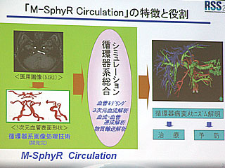4番目はRSS21から加わった新規プロジェクトで開発された「M-SphyR サーキュレーション」。これは、人体の循環器系のシミュレーションを通して病気の治療や予防に役立てようというシステムで、血管モデリングツールMedicalImageと、三次元血流解析ソルバーFrontFlow/Blood(FrontFlow/Redの有限体積法をベースにしたもの)、血流と血管壁の連成解析ソルバーFrontFlow/FSI(完全な新規開発ソルバー)−から構成され、さらにさまざまなアドインモジュールを組み込んでいく計画である。血流および血流と血管壁の相互作用、また血流による物質輸送を考慮し、それと血管壁との相互作用までを解析できるようにする。