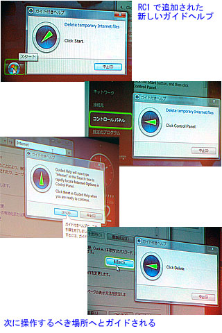 また、ユニークなのが「ガイドヘルプ」機能。「インターネットの一時ファイルを削除する」など行いたい操作をヘルプ画面で調べると、その操作法を逐一ガイドしてくれるというもの。方位磁石のようなアイコンがクリックするボタンやメニューの部分に次々に飛んで、次にどの操作をすればいいのかをていねいに教えてくれる。RC1では、この機能は英語だが、製品版では日本語化される。当初は、同社に対して最も問い合わせの多い30種類の操作法を組み込むが、以降はオンラインヘルプから新しいコンテンツをダウンロードするかたちで、ガイドできる操作を順次増やしていく。