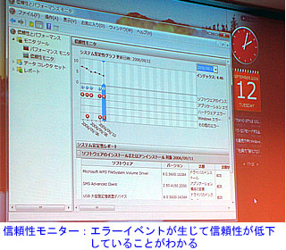 さらに、新しい「信頼性とパフォーマンスモニター」は企業の管理者などにとって有用な機能。とくに、信頼性モニターは、ソフトウエアのインストール、アプリケーションエラー、ハードウエアエラー、システムエラー、その他のエラーなどの発生を記録し、パソコンが安定して動いているかどうかを数値的に示す機能を持つ。管理者がリモートで各パソコンの状況をモニターできるので、不具合発生時などの原因究明がスピーディーに行えるという。