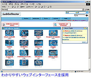 管理する対象ごとにデータベースがモジュール化されており、トップページからわかりやすいアイコンをクリックするだけで、専用のページで入力や検索を行うことができる。具体的には、保管場所情報や使用履歴などを含めた細胞株の情報管理、制限酵素切断部位の編集などを含むプラスミド情報の管理、プラスミドや配列情報に対するマッチング検索に対応したプライマー情報の管理、DNA/RNA/たん白質の配列情報管理、試薬ベンダー情報や実験情報と連動した抗体情報の管理、保管場所や使用履歴を含めた検体情報の管理、構造式を含む化合物データの管理、保管場所や残量情報を含めた試薬管理、メンテナンス情報を含めた分析機器などの機器・器具類の管理、実験手順書や文献情報などの電子ファイルの管理、ケージごとの実験動物のデータ管理、グループ内の研究者や取引業者などのアドレスブック管理−といった機能を持つ。これらのモジュールは今後も順次追加されていく。