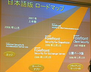 同社では、来年にはオフィスコミュニケーションサーバーも対象にする予定。また、クライアントソリューションも「フォアフロント・クライアントセキュリティ」の名称で投入する。こちらは12月13日から日本語ベータ版を配布することが決まっている。セキュリティポリシーをクライアント向けに展開することが容易になり、わかりやすい管理者向けのレポートツールなども用意される。