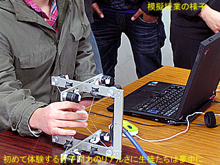 基本的な講義のあと、生徒たちはSPIDER-Gを自分で操作し、分子間力を“体感”した。ボールを分子に近づけていくと、最初はゆるやかな引力がファンデルワールス力によって働くが、ある距離からはクーロン力による静電相互作用が生じて強い反発力が感じられるようになる。