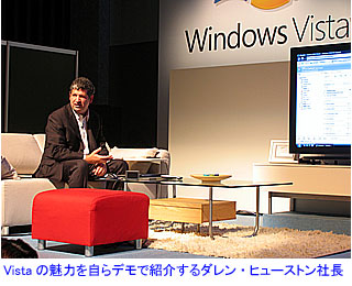2007.01.31−マイクロソフトは30日、WindowsVistaおよび2007オフィスを店頭で販売開始したと発表した。これらをプリインストールしたパソコンも18社/247機種が順次発売される。同時に、Vistaのユーザー体験を高めるための5分野/45種類のサービスを、41社のパートナーが提供することも明らかにされた。日本法人のダレン・ヒューストン社長は、「Vistaはエンターテインメント性がきわめて高く、使えば使うほど愛着がわいて、もう以前のWindowsXPには戻れなくなる。XPの2倍、ブームを起こしたWindows95の5倍は売れるだろう」と強い自信を示した。