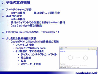 最後に、製品の将来構想としては、基盤のアーキテクチャーをドットネットに移行させ、最新のIT環境への対応とパフォーマンスアップを目指すことにしている。既存ユーザーには保守の範囲内で対応し、エンドユーザーから見た操作性が変わるようなことはない。また、検索機能を強化する一環として、グーグルのように自由なキーワードで調べるような機能を実現したいということだ。