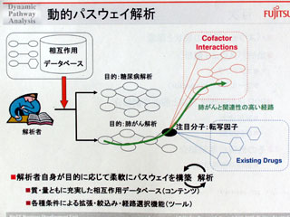 最後は、パスウェイ解析ツール「P2Pインスペクター」を用いたサービスで、やはりこのソフトも製品化はされていない。文献データベース「MEDLINE」の中から自然言語処理によって375万件の相互作用情報を抽出しており、利用者の視点でダイナミックにパスウェイを構築したり解析したりすることができる。バイオ文献に適したテキストマイニング技術が組み込まれており、分子間相互作用や疾患・副作用情報などを系統立てて引き出すことが可能。