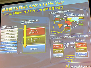 また、システム内のコードおよびオブジェクトが階層化されており、カスタマイズ部分がバージョンアップの影響を受けにくい。具体的には、システムの標準機能が4階層で構成され、その上にサードパーティーのアドオンやユーザーカスタマイズで使用できる領域が4階層設定されている。このため、標準機能がバージョンアップしても、カスタマイズした階層はそのまま引き継ぐことが可能。他のERP製品と比べて長く使えることが特徴になるという。