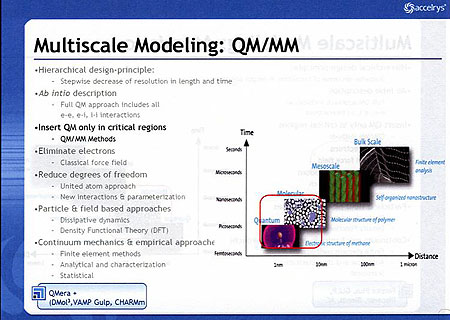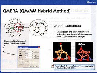 新ツールであるQMERAは、量子力学と分子力学とのハイブリッド計算手法を提供するもので、大きな分子の系の重要な部分だけを量子力学的に解析するなどの用途で利用できる。量子力学で電子状態がわかるため、例えば触媒分子の反応に関係する部位の特性を調べるといったことが可能。具体的には、量子力学エンジンとしてDMol3とVAMP、分子力学エンジンとしてGULPとCHARMmを組み合わせることが可能。