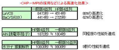 高速処理が求められるため、これまでもPCクラスター環境で利用されることが多かったが、今回は日本HPの「XCクラスター」に最適化することでさらに強力なシステムを実現させた。具体的には、HPが提供している並列処理ライブラリー“HP-MPI”を全面的に採用し、ソースコードレベルのチューニングも実施した。実際のベンチマークでは、最適化していない通常版のPHASEと比べて、バナジウム酸化物の計算(4並列)で88%の高速化、アルミニウム窒化物の計算では4並列で通常版の8並列相当のスピードを達成、水分子の振動解析では8並列で通常版の16並列の9割に相当する性能を実現したという。(写真参照)