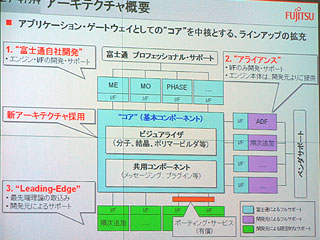 今回の新プラットホーム「SCIGRESS」は、10月24日にユーザー会の位置づけで開催された「富士通計算化学セミナー2007」で明らかにされたもの。古典力学から第一原理計算までのマルチスケール対応、並列計算の強化など、より大規模な系を高速・高精度に解析するとともに、外部プログラムとの連携による発展性、使いやすいユーザーインターフェースを実現することを目的としている。