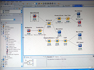 KNIMEは、独コンスタンツ大学で開発されたソフトで、プログラムの構成単位を“ノード”と呼び、このノードをディスプレイ上で結んでいくだけで“プロトコル”と呼ばれるワークフローをデザインすることができる。データ移行やデータ変換などの処理手順をノードとして組み込んでおくことにより、複数のプログラムをスムーズに連携させることができるようになる。