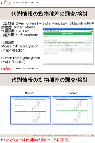 実際にADME試験を行うと、種の差によって代謝産物が変わる場合があり、それによって毒性が発現してしまうこともある。構造式による検索も可能であるため、同じ代謝酵素でもヒトとマウスで反応が異なるなどのデータがヒットすれば、種差による重要な情報が得られることになるという。