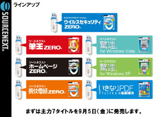 具体的に、Uメモシリーズの第1弾は「ウイルスセキュリティZERO」(4,980円)、「筆王ZERO」(4,980円)、「携快電話ZERO」(4,980円)、「ホームページZERO」(9,800円)、「驚速XP版」(3,970円)、驚速Vista版」(3,970円)、「いきなりPDF Platinum 特別版」(3,970円)の7タイトル。すべて、CD-ROM版と同じ価格。