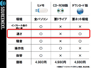 同社によると、光学ドライブ未搭載のパソコンのユーザーはソフトを購入する割合が少ないという調査結果がある。また光学ドライブなしのノートパソコンが、2013年にはノート型全体の25%に達するという調査もあるという。これに対し、USBポートを備えていないパソコンはいまや皆無。そのうえ、ソフトのインストールもCD-ROMに比べて大幅に高速で、うるさい駆動音がせず、インストール後にメモリーとして使用できるなど、USBメモリー版には弱点がまったく見当たらないとしている。