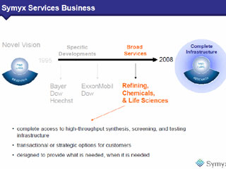 Symyxリサーチ事業は、ここへ来て新たなステージに進みつつある。当初は少数の顧客と密接に連携しつつ、顧客固有の問題解決型のスタイルで、化学品・ポリマー・電子材料などの分野にフォーカスし“ハイスループット実験”技術の開発を行ってきた。これに対し、今後はさらに幅広いサービスを展開していく。具体的には、石油精製、化学、ライフサイエンスなどの分野を対象に、3ヵ月間という短期間で結果を出すプロジェクト推進を通じ、多くの案件の獲得を目指す。