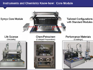 Symyxツールズは、ハイスループット実験を行うための製品化されたシステムで、少量のサンプルで大量の実験をパラレルに実施する“装置”、大量の実験データを取得・管理・可視化する“ソフト”、さらに特異的で複雑な試験要求にこたえることができる“ノウハウ”−の3つを包括的に提供できることを特徴としている。