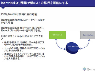 ISIS側からはDirect6.1を介してIsentrisへ、Isentris側からもDirect6.1を介してISISのデータベースへアクセスすることができる。ISISとIsentrisの両方からデータの登録と検索が行え、データ管理も簡素化される。これにより、データベースの完全移行を都合の良いときに実施することができるほか、データベース移行と切り離してユーザーグループの移行作業を行えるようになった。つまり、ISISを停止することなくIsentrisを段階的に導入することが可能。