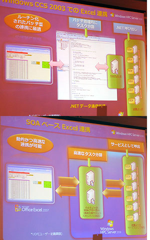 そうした金融計算にメインで使われるのが意外にもエクセルである。WindowsCCS時代も、エクセルの計算をPCクラスターで分散処理する仕組みが1つの売り物となっていた。これに対して、今回のWindowsHPCサーバーではSOAベースのエクセル連携機能を実現している。以前の仕組みがルーチン化されたバッチ型の連携を得意としていたのに対し、今回は動的かつ高速な連携を達成したことが特徴になる。
