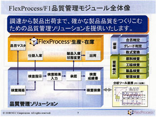 FlexProcessは、約330社の導入実績を持つNEC独自のERPパッケージで、業務テンプレート「F1ソリューションズ」を適用することにより、システム構築期間を大きく短縮することが可能。今年2月から提供している生産管理モジュールに続くテンプレート第2弾が今回の品質管理モジュールとなっている。