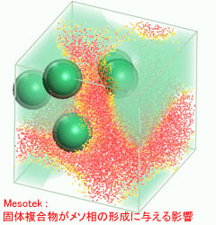 新エンジンの1つは「Mesotek」で、これまで提供されていたMesoDynの後継製品となる。次世代型擬スペクトル法を利用した自己無撞着場法プログラム。複雑流体を粗視化して表現し、系のポテンシャル場と密度場の鞍点の最適化や動的な発展の解析を行うことができる。とくに、柔らかい材料のなかに硬い材料が分散して運動するといった複雑な対象を解析できることが、これまでのMesoDynとの大きな違いになるという。基本的に、ナノ粒子分散やナノ複合材料の研究に活用できる。