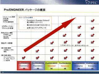 Pro/ENGINEERは、基本の3次元CAD/CAM機能を充実させたファウンデーションEE、ファウンデーションXE、製品データ管理(PDM)を統合したアドバンスドスタンダードエディション(アドバンスドSE)、アドバンスドXE、コラボレーションやCAE機能を組み込んだハイエンドのエンタープライズSE、エンタープライズXE−までのラインアップが揃っている。今回のファウンデーションEEはローエンド製品ではあるが、アップグレードパスが保証されていることが大きな特徴だという。