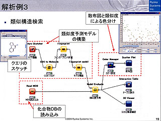 例えば、(1)複数の化合物ファイルのマージ/脱塩/重複チェック/フィルタリングといった一連の化合物処理、(2)化合物データベースからディスクリプター計算をし、統計処理を経て予測モデルを構築するQSAR解析、(3)データベースからドラッグライクな化合物を抽出し、ファーマコフォアを検索してドッキングシミュレーションを実行し、スコア順にリガンド構造を確認−といった活用事例が考えられるという。