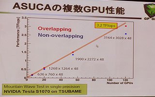 今回の青木教授らの研究では、WRFと同等の次世代気象モデルとして気象庁が開発中の「ASUCA」のプログラム全体をGPU化し、学内のスーパーコンピューター「TSUBAME1.2」に搭載されているGPUシステムで動作させた。具体的には、シングルGPUで44.3ギガFLOPS(CPUの1コアに対して約80倍の性能)、さらに120個のGPUを並列利用することで3.22テラFLOPSの実行性能を達成した。2キロメートルの格子間隔で、日本列島全土を含む「3164×3028×48」の計算格子を用いると、120GPUで実際の6時間分の気象現象が70分で解析できたことになる。