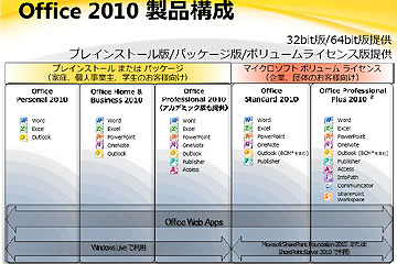 今回のOffice 2010では、個人向けと企業向けが明確に区分され、プレインストールまたはパッケージ版は「パーソナル」(Word、Excel、Outlook)、「ホーム&ビジネス」(Word、Excel、PowerPoint、OneNote、Outlook)、「プロフェッショナル」(Word、Excel、PowerPoint、OneNote、Outlook、Publisher、Access)の3つのエディション、企業向けボリュームライセンス版は「スタンダード」(Word、Excel、PowerPoint、OneNote、Outlook、Publisher)、「プロフェッショナルプラス」(Word、Excel、PowerPoint、OneNote、Outlook、Publisher、Access、InfoPath、Communicator、SharePoint Workspace)の2つのエディションが用意される。なお、パッケージ版の「プロフェッショナルアカデミック」は「プロフェッショナル」と同内容で、学生および教職員だけが購入できる。