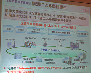 2010.08.05−富士通は4日、記者説明会を開催し、製薬業向けのソリューションコンセプトである「tsPharma」を発表、幅広い業務アプリケーションを積極的にクラウド/SaaSに対応させていく方針を明らかにした。今年1月に開始した臨床開発向けの「tsClinical」に続き、新薬申請文書管理システムを9月から、MR(医薬情報担当者)向けの営業支援システムを8月からSaaSにて提供開始する。いち早くクラウド志向を前面に押し出すことで、製薬業向け事業のさらなる拡大を図る。
