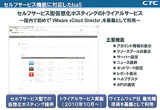 3つ目の新サービスは、IaaS/PaaS領域に属するセルフサービス型仮想化ホスティングサービス。米ヴイエムウェアのクラウド向けポータルソフト「VMware vCloud Director」を基盤としており、ユーザーが自分で必要に応じてサーバーやストレージ、ネットワークなどのITリソースを増減させることが可能。同社ではすでに、専門エンジニアがフルアウトソース型で対応する仮想化ホスティングサービス「TechnoCUVIC」を提供しているが、セルフサービス型をメニューに加えることでユーザーの選択肢を広げる。まずは、トライアルサービスとして開始し、来年1月から本サービスに移行する予定である。
