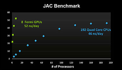 なかでも、分子動力学法(MD)シミュレーションに関するJACベンチマークで、1日に計算できる最大量を測定したところ、CPUは数を増やすほどに並列効率が落ち、192個のクアッドコアCPUでの46ナノ秒間の計算が最大値になったが、GPUは8個で52ナノ秒間の計算を実行できたという。