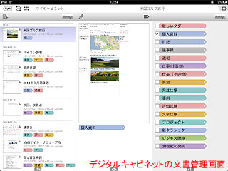 作成した文書はローカルに保存できるが、クラウドサービスとして提供される「デジタルキャビネット」に蓄積していくことが可能。文書にはタグをつけて整理できるので、多くの文書があっても管理しやすい。