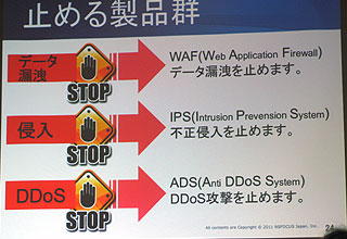 具体的なアプライアンス製品としては、ウェブアプリケーションファイアウォール(WAF)の「P300/P600/P1600」(250万円から)、IPSの「NIPS200/600/1200/2000」(130万円から)があり、小規模から大規模までの企業で利用が可能。また、分散サービス妨害(DDoS)攻撃を防止する通信キャリア向けの「ADS4000/6000」(数千万円規模)もラインアップ。さらに、マルウエア感染やサイト改ざんなどの24時間対応常時監視サービス、ウェブアプリケーションやプラットホームの脆弱性検査サービスなどを提供するASPサービス「WSP」も提供している。WSPには、今春にDNSモニタリングサービスもメニューに加えるという。