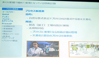 組立型製造業、プロセス製造業、土木・建築などさまざまな業種で採用されているが、「Mathcadで数式を定義すれば誰がみてもわかりやすいのでレビューもしやすい。このため、製薬業における新薬承認プロセスを短縮する目的でも利用されている」(クーチャン氏)という。