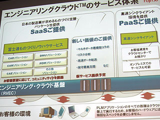 2011.06.22−富士通は21日、製造業の設計・開発業務をクラウド上で支援する次世代ものづくり環境として、「エンジニアリングクラウド」を10月から提供開始すると発表した。CADなどのアプリケーションをクラウド上で提供する「エンジニアリングクラウド/SaaS」と、ホスティングサービスを提供する「エンジニアリングクラウド/PssS」の2種類がある。エンジニアリングに特有の巨大な設計データなどを効率良く転送する独自技術を組み込んだことが最大の特徴となっている。利用料金は、月額数万〜数十万円のレンジで、3年間に100億円の売り上げを見込んでいる。