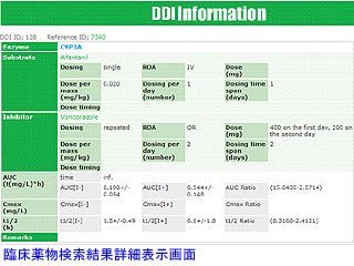 臨床薬物相互作用データは、ヒト臨床試験において、薬物を単独投与した場合と複数を併用した場合の薬物の血中濃度の上昇率などを収載したもの。現在、投与計画や血中濃度、消失半減期、最高血中濃度など約1,500件のデータが利用できる。