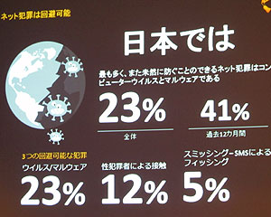 ネット犯罪で検察官を務めた経験もある同社サイバーセキュリティ部門のリードアドバイザー、アダム・パーマー氏は「上位に来るネット被害のほとんどはセキュリティソフトを利用することで防止できる。ネットワークの攻撃は複雑化しているが、それでも無防備な人は襲うのが簡単なのでやはり狙われやすい。地下鉄の中でポケットから財布が飛び出ている人がスリの被害にあうのと同じことだ。まずはセキュリティソフトをインストールして最新の状態に保つことが第一歩だ」と強調した。