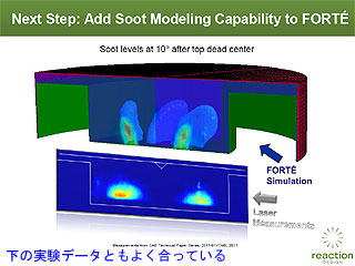 同社ではさらに、自社の3次元流体解析ソフト「FORTE」に煤モデリング機能を統合し、今年後半にはリリースする予定。エンジン内部での燃料の燃焼と煤の発生状況をダイナミックに解析できるので、より実用的なツールとしてクリーンエンジン開発に役立つことになる。レーザー計測での実証実験の結果ともよく合っている。