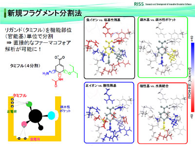 インフルエンザウイルスの膜表面たんぱく質であるノイラミニダーゼ(386残基)と阻害剤タミフルとの解析例では、タミフル分子を正イオン基、負イオン基、親水基と疎水基の4つのフラグメントに分割し、それぞれの官能基がどのアミノ酸とどのように相互作用しているのかを確かめることができた(写真参照)。それらの相互作用の強さを調節することにより、より活性の高い分子設計を行うことが可能になる。また、アミノ酸の側鎖部分との相互作用を考察することによって、ウイルスのアミノ酸残基が変異することで起こる薬剤耐性や新型ウイルスへの対策にも役立つ可能性があるという。