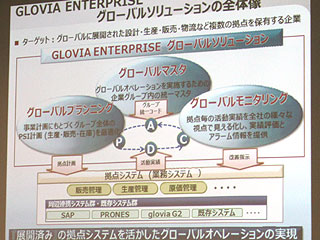 「GLOVIA ENTERPRISE」は、ローカル品番を変更することなく全社マスターを統一する「グローバルマスター」、見える化とアラーム情報で判断を支援する「グローバルモニタリング」、月次サイクルで計画と実需の差異の把握と需給調整を行う「グローバルPSI」(グローバルプランニング)−の3つの製品群で構成される。