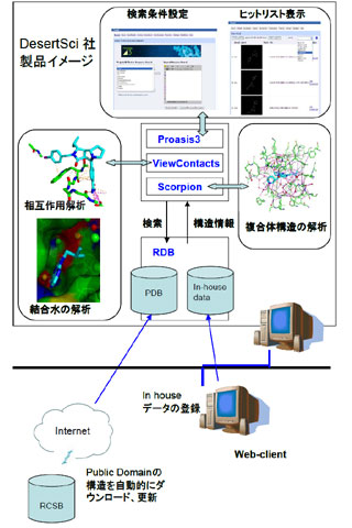 さて、デザート製品の全体像は別図に示した通りである。たん白質およびリガンドとの複合体の立体構造情報を格納するリレーショナルデータベースシステム「Proasis3」、たん白質とリガンド分子との相互作用解析を行う「ViewContacts」、ネットワークモデルの考え方に基づき複合体の安定構造を解析する「Scorpion」−が主要な製品。