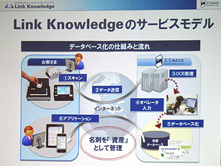 同社の「Link Knowledge」では、各社員が集めた名刺をスキャンしていくだけでクラウド上にデータベースができあがる。OCRで読み取るだけでなく専門オペレーターが手入力するので間違いがない。ユーザーがログインすると、自分が登録した名刺の企業の人事情報やニュースが表示されるほか、同僚社員が登録した名刺データも含めて一括検索することが可能。相手企業の名刺データを集約して組織図を自動的に作成する機能も持っているため、商談などのコンタクト先を誤ることなく、事前の情報収集も効率的に行える。