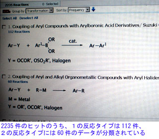 ここ数年はとくに反応情報を検索・活用する機能が重点的に強化されてきており、今回の新バージョンでは“反応タイプ別のグルーピング機能”が搭載された。データベースが豊富なSciFinderは、網羅的な検索が行える半面、ヒット件数が多くなって目的の情報をみつけにくいという悩みがあった。今回の新機能は、検索結果の回答集合をあらかじめ500種類に分類された反応タイプ(ニトロ化合物のアミンへの還元など)によってグループ化することが可能。教科書によく出てくるような人名反応も分類に入っているため、学生にとってもかなり使いやすくなっているという。