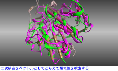 さらに、たん白質モデリングのための類似構造検索では、配列情報をまったく使わない新手法“二次構造モチーフ検索”が導入された。これは、ヘリックスやシートといった二次構造をベクトルとしてとらえて比較するもの。異なるたん白質の二次構造要素(SSE)を網羅的にマッチングさせる方法で、配列の相同性が極端に低くてもヒットすることが特徴。配列の相同性を重視する従来手法では、探索範囲は類縁たん白質を中心とした領域に絞られがちだったが、SSEを用いることにより、遠縁でも類似した構造を持つたん白質を引き当てることができる。
