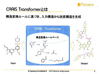 2013.06.29−パトコアは、創薬研究における化合物の合成展開に際して、分子構造を変換できる可能性を網羅的に示すことができる「CRAIS Transformer」(CRAISトランスフォーマー)を開発した。構造変換のための信頼性の高い知識ベースをあらかじめ装備していることに加え、社内で蓄積した知識をルールとして組み込むことも可能で、合成研究者の世代交代にともなうノウハウ継承にも役立つとして注目される。