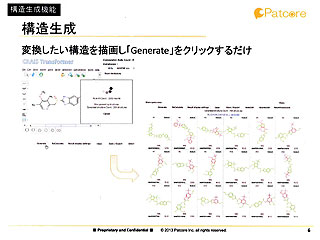 CRAISトランスフォーマーは、構造変換ルールに基づいて、入力構造から改変構造を自動生成する、いわば構造変換アイデア提示ツール。ルールベースとしては、京都大学の藤田稔夫名誉教授が開発した「EMIL」(ハンガリーのコンピュードラッグ社)に搭載されている変換例が標準装備されている。既知の医薬・農薬をもとに、生物学的に等価な約6,700件の変換例が収められている。来年にはさらに、英デジタルケミストリーが開発している「BIOSTER」からも約2万6,000件の変換例を収録する計画である。