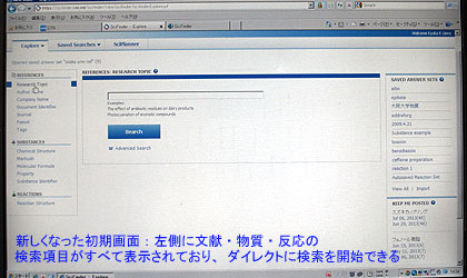 基本的な検索モードは「文献検索」「物質検索」「反応検索」の3つに分かれているため、これまではまず各モードに入ったあと、検索項目を指定し、キーワードなどを入れるという手順だった。これに対し、今回の最新版では、初期画面に文献・物質・反応の各検索項目がすべて表示されており、ユーザーはダイレクトに調べたい項目を指定することが可能。